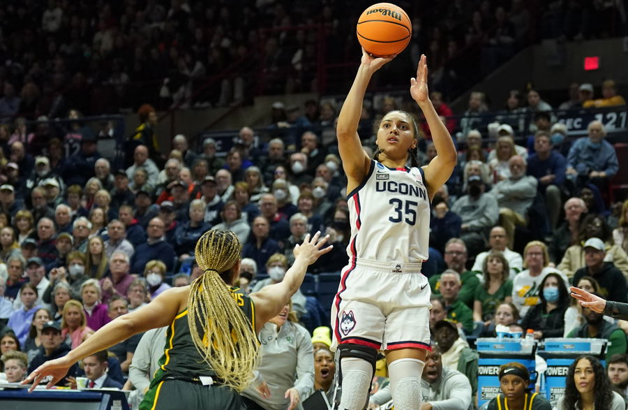 Mar 20, 2023; Storrs, CT, USA; UConn Huskies guard Azzi Fudd (35) shoots the ball against the Baylor Lady Bears in the first half at Harry A. Gampel Pavillion. Mandatory Credit: David Butler II-USA TODAY Sports