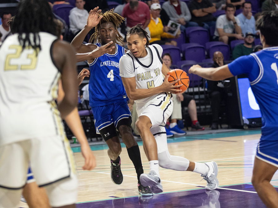 Isaiah Abraham of Paul VI drives around James Bryant of Canterbury in the City of Palms Classic on Saturday, Dec. 17, 2022, at Suncoast Credit Union Arena in Fort Myers.