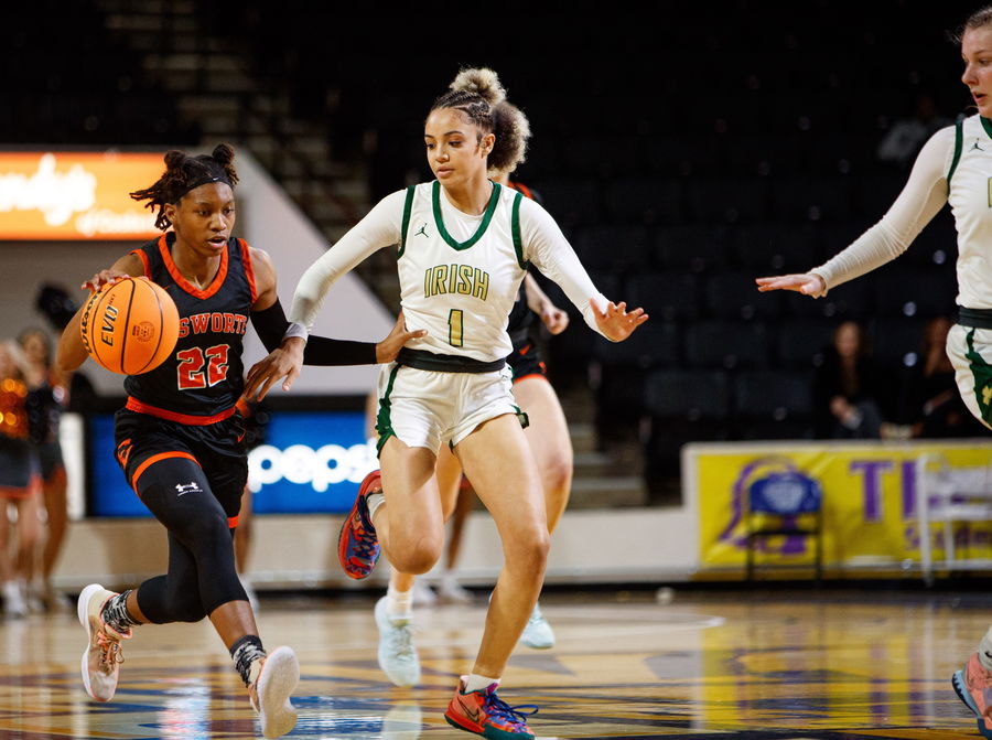 Ensworth Tigers Jaloni Cambridge (22) blocks from Knoxville Catholic Fighting Irish Jazmin Williams (1) during the division II championships at the Hooper Eblen Center in Cookeville, Tenn. on Mar. 4, 2023.
