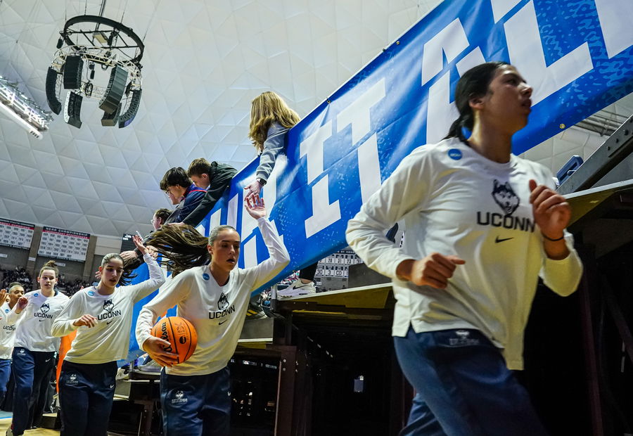Mar 20, 2023; Storrs, CT, USA; UConn Huskies Jana El Alfy (24), guard Nika Muhl (10) and teammates head back to the locker room after warming up before the start of the game against the Baylor Lady Bears at Harry A. Gampel Pavillion. Mandatory Credit: David Butler II-USA TODAY Sports