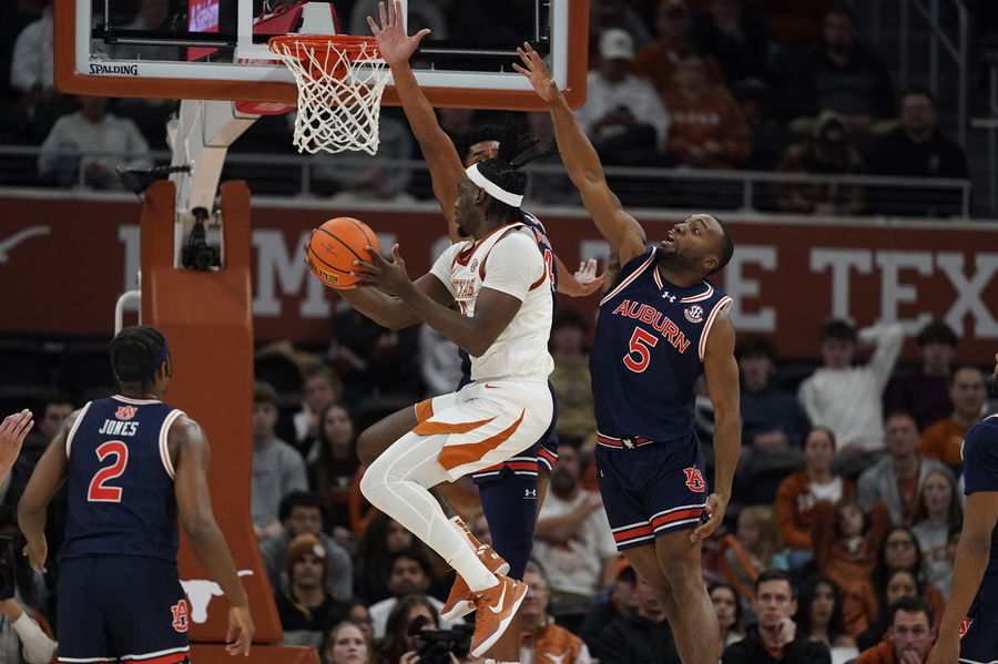 Jan 7, 2025; Austin, Texas, USA; Texas Longhorns forward Arthur Kaluma (6) drives to the basket against the Auburn Tigers forward Chris Moore (5) and center Dylan Cardwell (44) during the first half against the Auburn Tigers at Moody Center. Mandatory Credit: Scott Wachter-Imagn Images