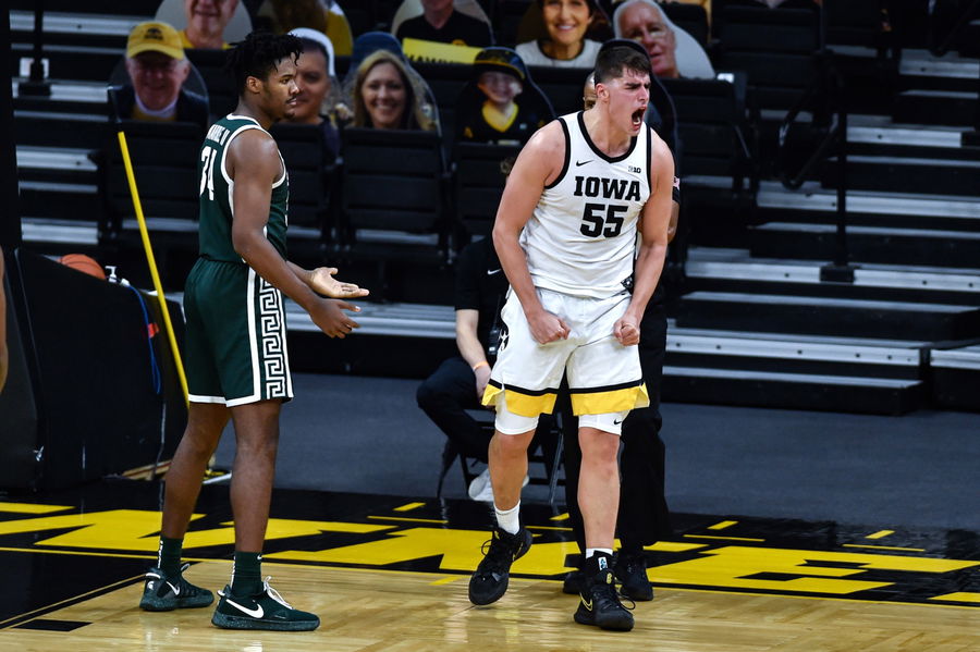 Feb 2, 2021; Iowa City, Iowa, USA; Iowa Hawkeyes center Luka Garza (55) reacts as Michigan State Spartans forward Julius Marble II (34) looks on during the first half at Carver-Hawkeye Arena. Mandatory Credit: Jeffrey Becker-USA TODAY Sports