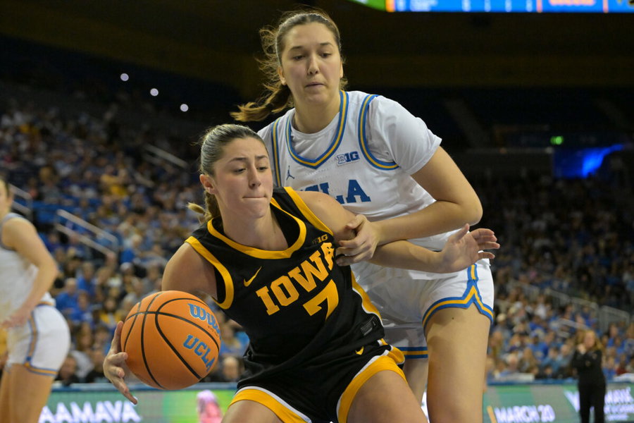 Feb 1, 2026; Los Angeles, California, USA; Iowa Hawkeyes guard Addie Deal (7) is defended by UCLA Bruins guard Lena Bilic (9) in the second half at Pauley Pavilion presented by Wescom Financial. Mandatory Credit: Jayne Kamin-Oncea-Imagn Images