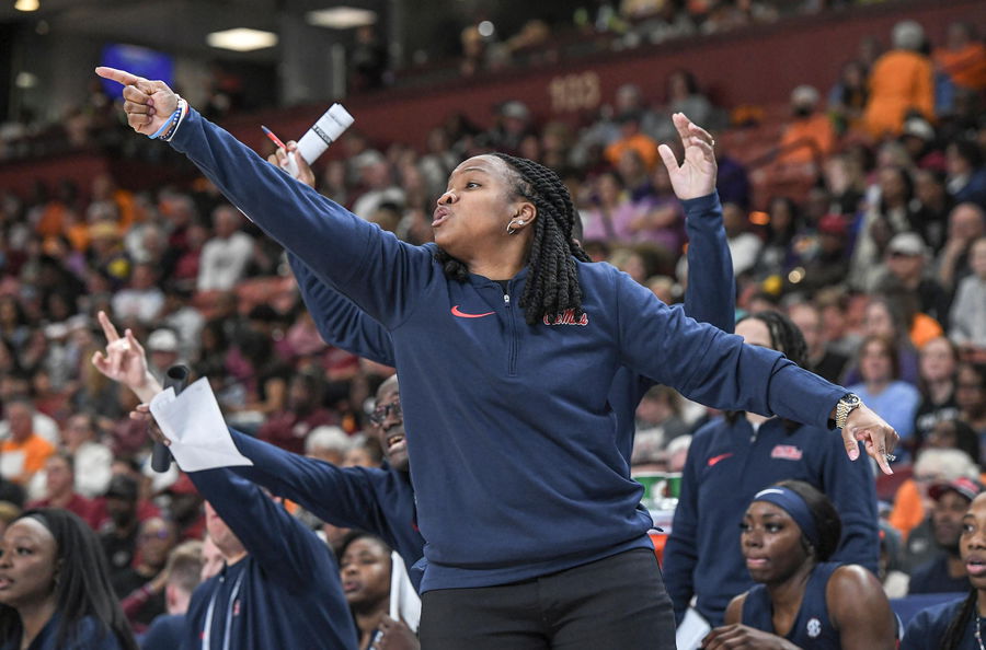 Ole Miss Head Coach Yolett McPhee-McCuin during the first quarter of the SEC Women’s Basketball Tournament game at the Bon Secours Wellness Arena in Greenville, S.C. Saturday, March 9, 2024.
