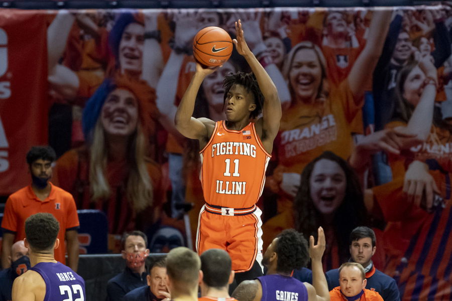 Feb 16, 2021; Champaign, Illinois, USA; Illinois Fighting Illini guard Ayo Dosunmu (11) shoots against the Northwestern Wildcats during the second half at the State Farm Center. Mandatory Credit: Patrick Gorski-USA TODAY Sports