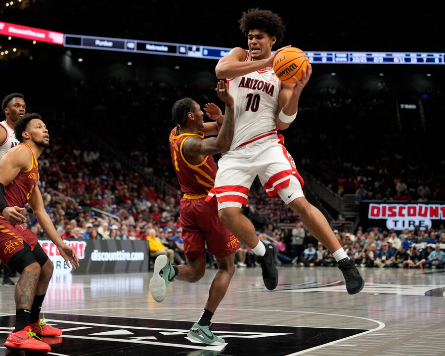 NCAA, College League, USA Basketball 2026: Iowa State Vs Arizona Big 12 Tournament MAR 13 2026: Arizona Wildcats forward Koa Peat 10 pulls down a rebound against Iowa State in the Big 12 Championship Tournament at T-Mobile center, Kansas City, Missouri. Jon Robichaud/CSM. Credit Image: Jon Robichaud/Cal Media Kansas City Missouri United States EDITORIAL USE ONLY Copyright: xx ZUMA-20260313_zma_c04_122.jpg JonxRobichaudx csmphotothree480206