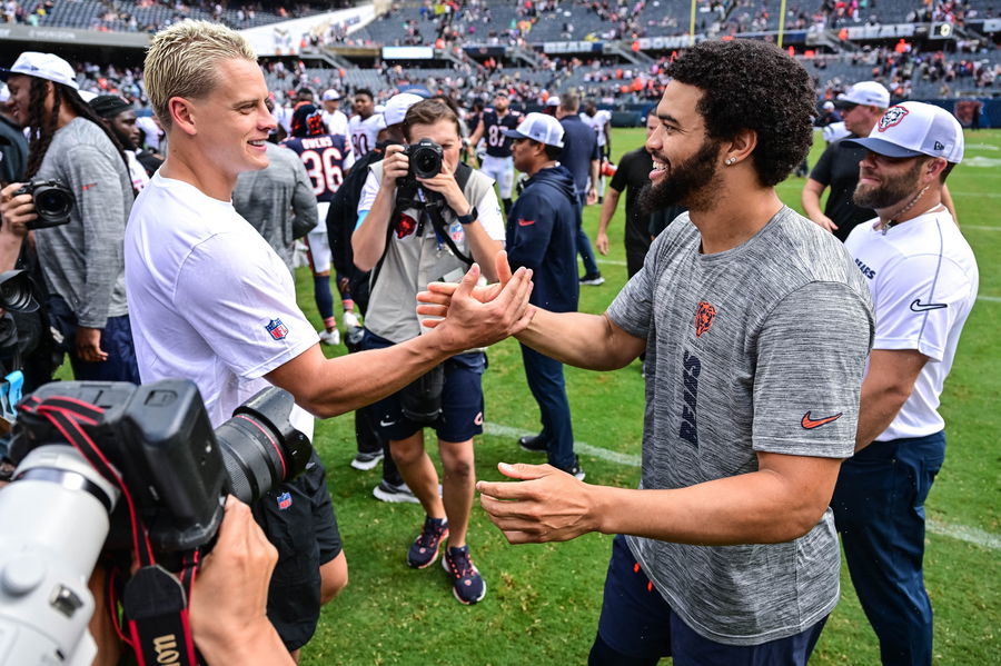 Aug 17, 2024; Chicago, Illinois, USA; Cincinnati Bengals quarterback Joe Burrow (9) and Chicago Bears quarterback Caleb Williams (18) shake hands after the game at Soldier Field. Mandatory Credit: Daniel Bartel-USA TODAY Sports