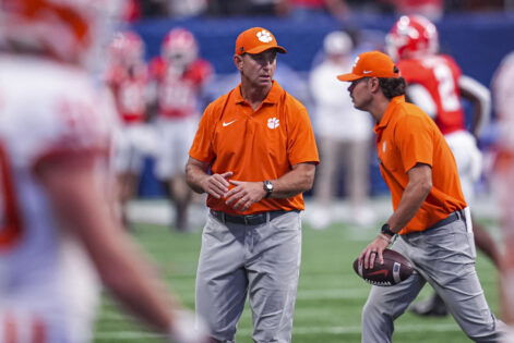 Aug 31, 2024; Atlanta, Georgia, USA; Clemson Tigers head coach Dabo Swinney shown on the field prior to the game against the Georgia Bulldogs at Mercedes-Benz Stadium. Mandatory Credit: Dale Zanine-USA TODAY Sports