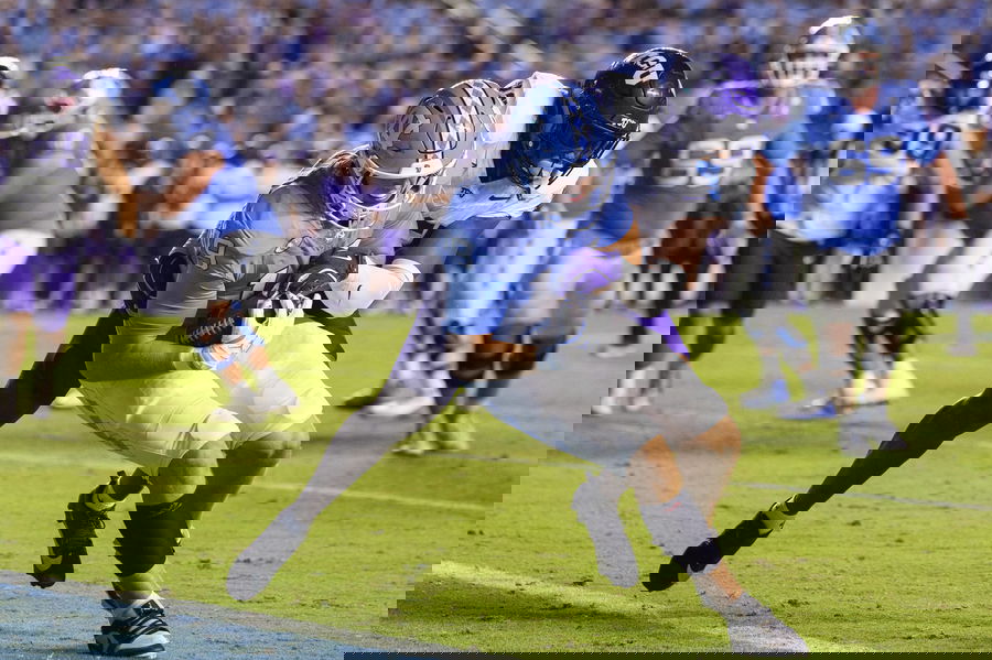 September 1, 2025: North Carolina Tar Heels tight end Jake Johnson 19 scores against TCU Horned Frogs linebacker Max Carroll 33 during the second half of the NCAA, College League, USA football matchup at Kenan Memorial Stadium in Chapel Hill, NC. /CSM Chapel Hill United States – ZUMAc04_ 20250901_zma_c04_029 Copyright: xScottxKinserx