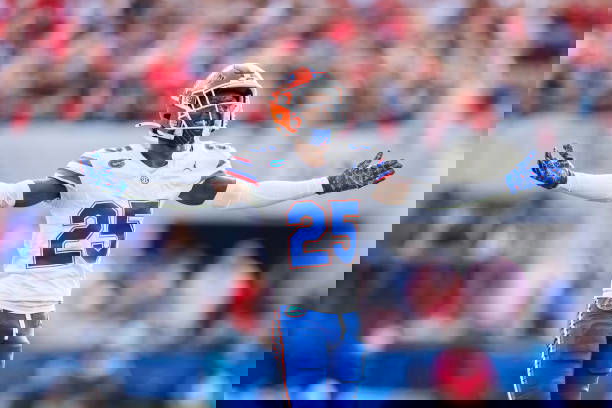 JACKSONVILLE, FLORIDA – NOVEMBER 02: Cormani McClain #25 of the Florida Gators reacts during the first half of a game against the Georgia Bulldogs at EverBank Stadium on November 02, 2024 in Jacksonville, Florida. (Photo by James Gilbert/Getty Images)