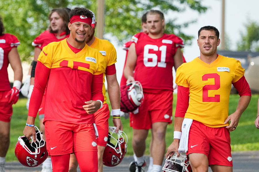 Jul 22, 2024; St. Joseph, MO, USA; Kansas City Chiefs quarterback Patrick Mahomes (15) and quarterback Ian Book (2) laugh while walking from the locker room to the fields prior to training camp at Missouri Western State University. Mandatory Credit: Denny Medley-USA TODAY Sports