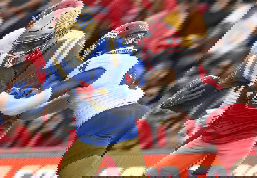 NCAA, College League, USA Football: Fresno State at UCLA Nov 30, 2024 Pasadena, California, USA UCLA Bruins wide receiver Kwazi Gilmer 3 tries to break free from Fresno State Bulldogs linebacker RL Miller 4 during the third quarter at Rose Bowl. Pasadena Rose Bowl California USA, EDITORIAL USE ONLY PUBLICATIONxINxGERxSUIxAUTxONLY Copyright: xRobertxHanashirox 20241130_gma_wr6_0346