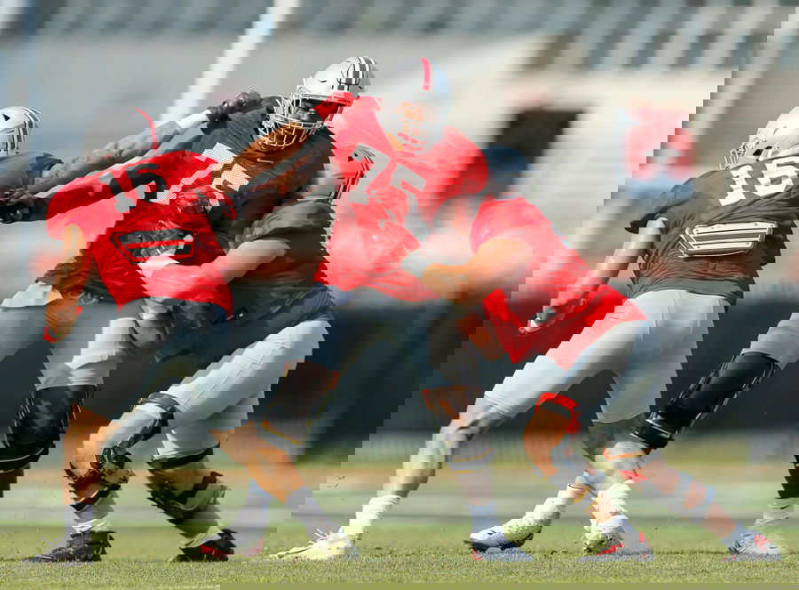 Syndication: The Columbus Dispatch Ohio State Buckeyes offensive lineman Thayer Munford 75 blocks tight end Cade Stover 16 and offensive lineman Zen Michalski 65 during football training camp at the Woody Hayes Athletic Center in Columbus on Friday, Aug. 6, 2021. Ohio State Football Training Camp Columbus OH , EDITORIAL USE ONLY PUBLICATIONxINxGERxSUIxAUTxONLY Copyright: xAdamxCairns/ColumbusxDispatchx 16522868