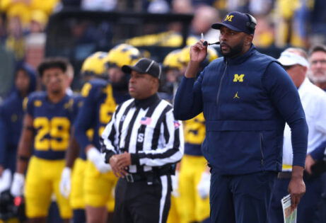 ANN ARBOR, MICHIGAN – NOVEMBER 02: Head coach Sherrone Moore of the Michigan Wolverines looks on during the first half against the Oregon Ducks at Michigan Stadium on November 02, 2024 in Ann Arbor, Michigan. (Photo by Gregory Shamus/Getty Images)