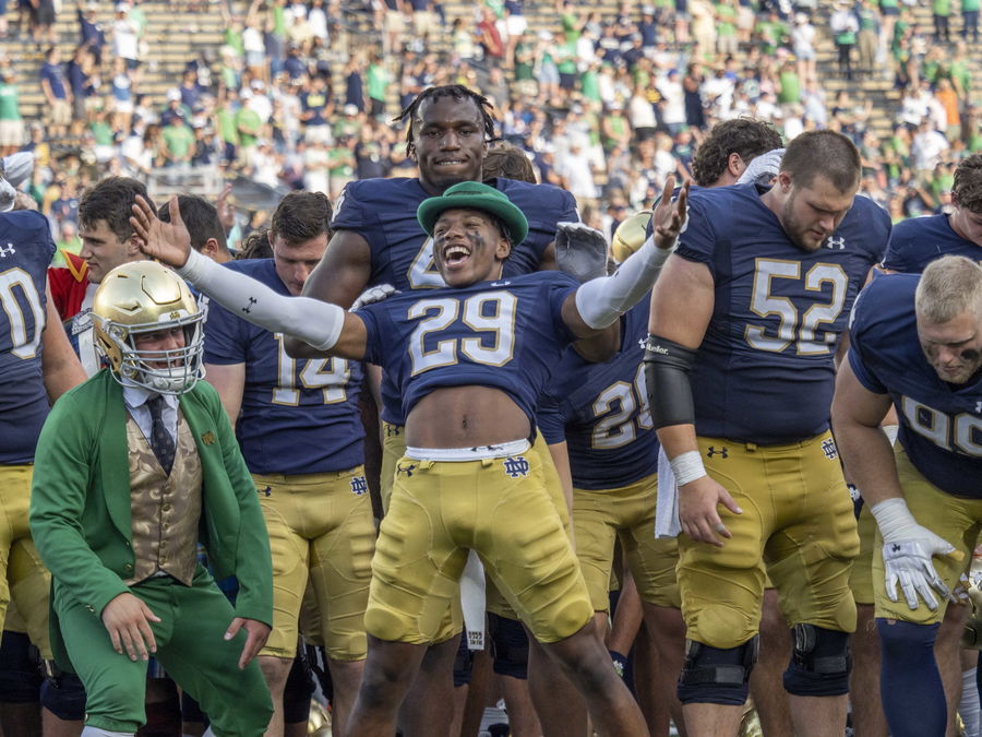 SOUTH BEND, IN – SEPTEMBER 02: Notre Dame Fighting Irish cornerback Christian Gray (29) celebrates with his teammates after the college football game between the Tennessee State Tigers and Notre Dame Fighting Irish on September 2, 2023, at Notre Dame Stadium in South Bend, IN. (Photo by Joseph Weiser/Icon Sportswire via Getty Images)