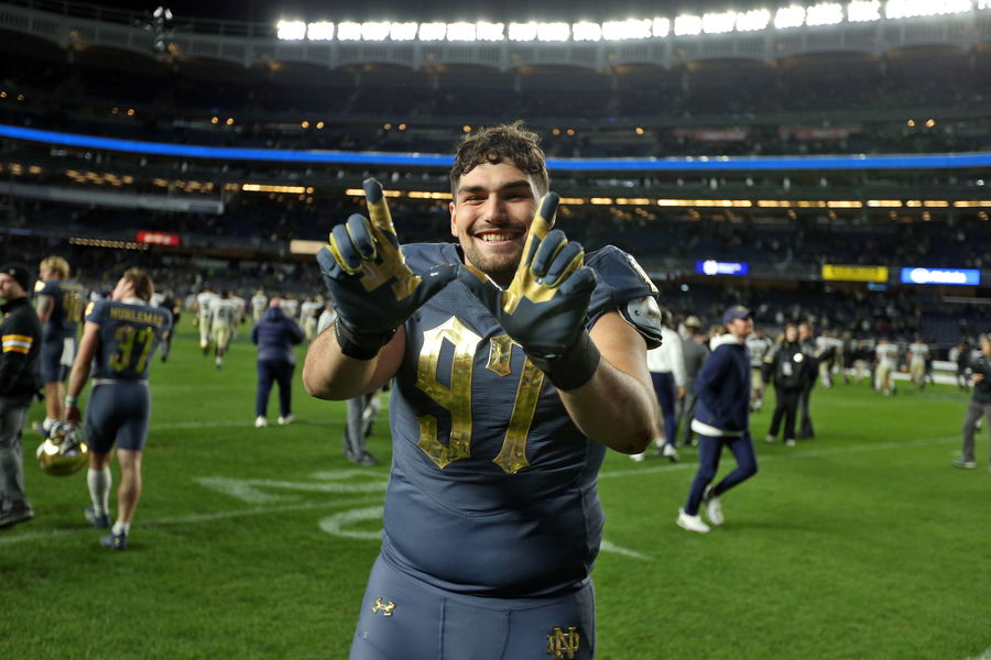 Nov 23, 2024; New York, New York, USA; Notre Dame Fighting Irish defensive lineman Gabriel Rubio (97) celebrates after a win against the Army Black Knights at Yankee Stadium. Mandatory Credit: Danny Wild-Imagn Images