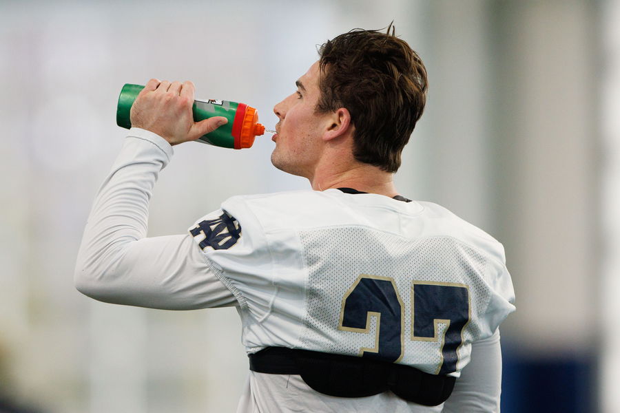 Notre Dame cornerback Max Hurleman (37) takes a water break during a Notre Dame football practice at Irish Athletic Center on Sunday, Jan. 5, 2025, in South Bend.