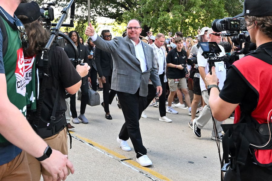 Aug 31, 2024; College Station, Texas, USA; Texas A&M Aggies head coach Mike Elko arrives prior to the game against the Notre Dame Fighting Irish at Kyle Field. Mandatory Credit: Maria Lysaker-USA TODAY Sp