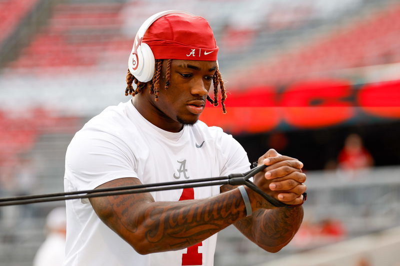 NCAA, College League, USA Football: Georgia at Alabama Sep 28, 2024 Tuscaloosa, Alabama, USA Alabama Crimson Tide quarterback Jalen Milroe 4 warms up prior to their game against the Georgia Bulldogs at Bryant-Denny Stadium. Tuscaloosa Bryant-Denny Stadium Alabama USA, EDITORIAL USE ONLY PUBLICATIONxINxGERxSUIxAUTxONLY Copyright: xJohnxDavidxMercerx 20240928_jdm_sx1_006