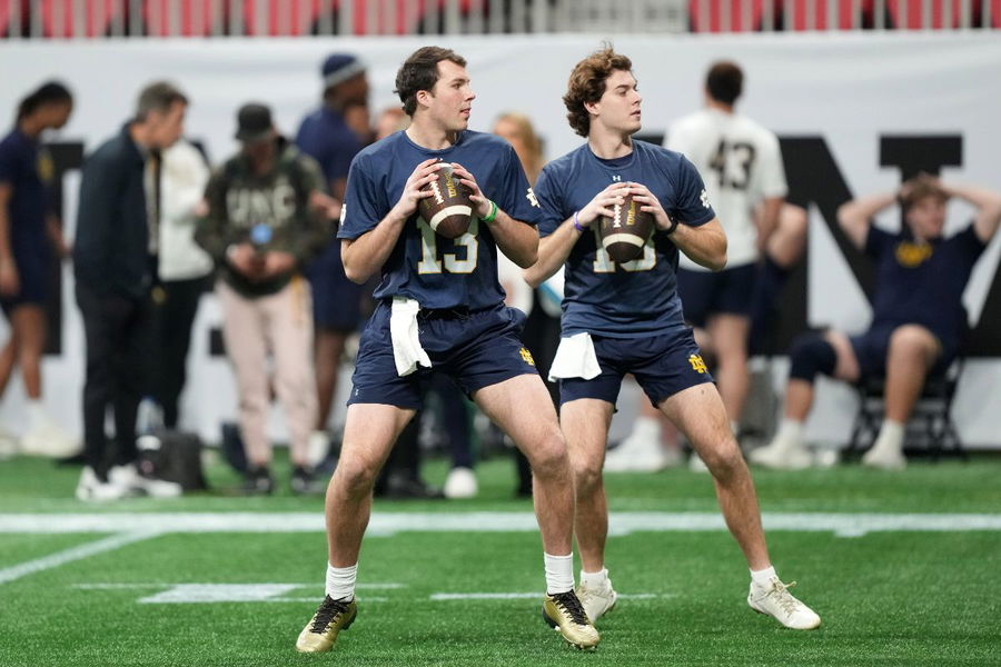 Jan 18, 2025; Atlanta, GA, USA; Notre Dame Fighting Irish quarterback Riley Leonard (13) and quarterback Steve Angeli (18) throw the ball during practice at Mercedes-Benz Stadium. Mandatory Credit: Kirby Lee-Imagn Images