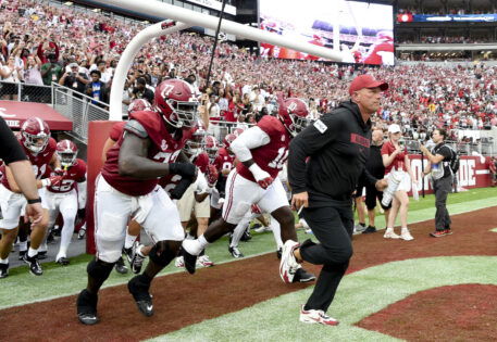 Aug 31, 2024; Tuscaloosa, Alabama, USA; Alabama Crimson Tide head coach Kalen DeBoer leads his players onto the field at Bryant-Denny Stadium for his first game as head coach. The Crimson Tide played Western Kentucky Hilltoppers. Mandatory Credit: Gary Cosby Jr.-USA TODAY Sports