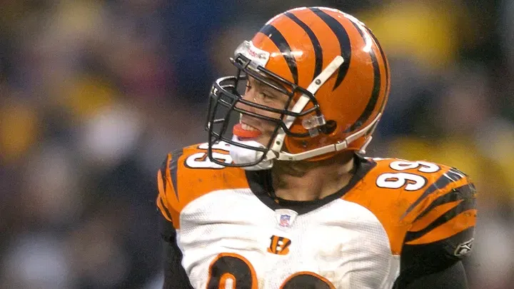 Cincinnati Bengals’ David Pollack is all smiles after his sack on the Steelers quarterback Ben Roethlisberger at Heinz Field in Pittsburgh on Dec. 4, 2005. (The Enquirer/Jeff Swinger)