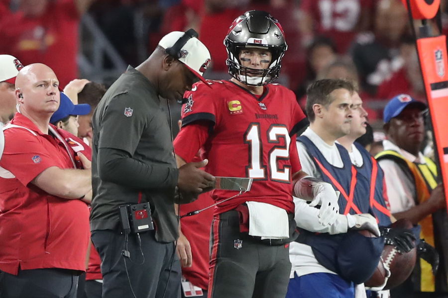 TAMPA, FL – DECEMBER 05: Tampa Bay Buccaneers Offensive Coordinator Byron Leftwich talks with Quarterback Tom Brady (12) along the sidelines during the regular season game between the New Orleans Saints and the Tampa Bay Buccaneers on December 05, 2022 at Raymond James Stadium in Tampa, Florida. (Photo by Cliff Welch/Icon Sportswire via Getty Images)