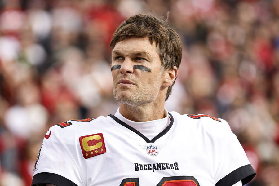 SANTA CLARA, CALIFORNIA – DECEMBER 11: Tom Brady #12 of the Tampa Bay Buccaneers looks on during the national anthem prior to an NFL football game between the San Francisco 49ers and the Tampa Bay Buccaneers at Levi’s Stadium on December 11, 2022 in Santa Clara, California. (Photo by Michael Owens/Getty Images)