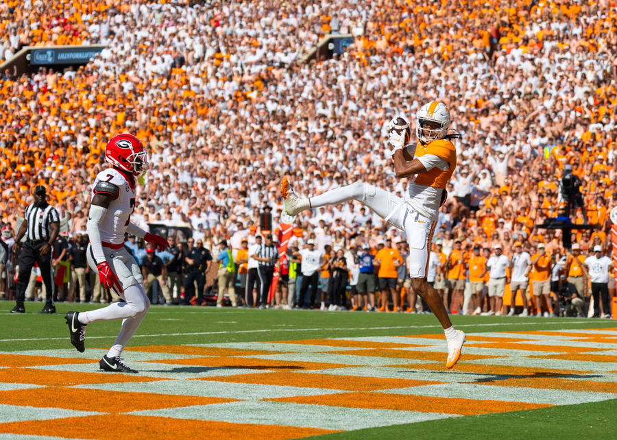 September 13, 2025: Chris Brazzell II 17 of the Tennessee Volunteers catches a pass for a touchdown during the NCAA, College League, USA football game between the University of Tennessee Volunteers and the University of Georgia Bulldogs at Neyland Stadium, Knoxville, TN /CSM Knoxville United States – ZUMAc04_ 20250913_zma_c04_216 Copyright: xTimxGangloffx