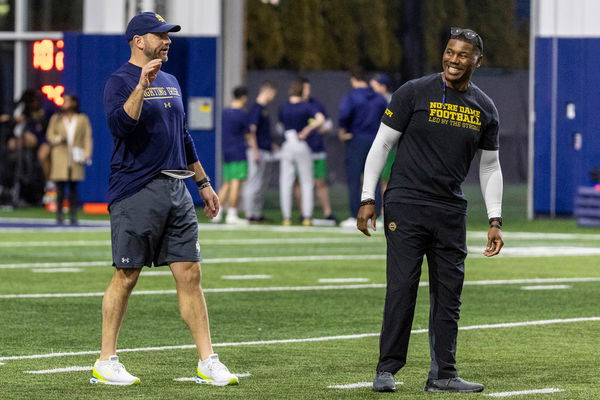 Notre Dame offensive coordinator Gerad Parker and Notre Dame running backs coach Deland McCullough during Notre Dame Spring Practice on Wednesday, March 22, 2023, at Irish Athletics Center in South Bend, Indiana.