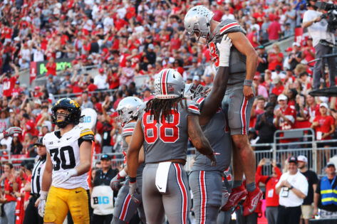 Oct 5, 2024; Columbus, Ohio, USA; Ohio State Buckeyes quarterback Will Howard (18) celebrates after a touchdown run against the Iowa Hawkeyes during the third quarter at Ohio Stadium. Mandatory Credit: Joseph Maiorana-Imagn Images