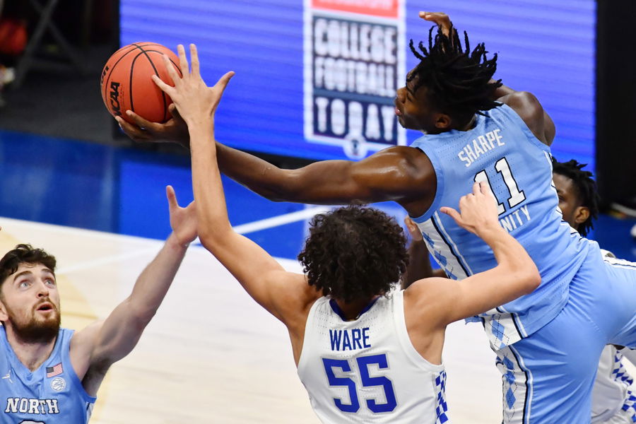 Dec 19, 2020; Cleveland, Ohio, USA; North Carolina Tar Heels forward Day’Ron Sharpe (11) and guard Andrew Platek (3) go for a rebound against Kentucky Wildcats forward Lance Ware (55) during the second half at Rocket Mortgage FieldHouse. Mandatory Credit: Ken Blaze-USA TODAY Sports