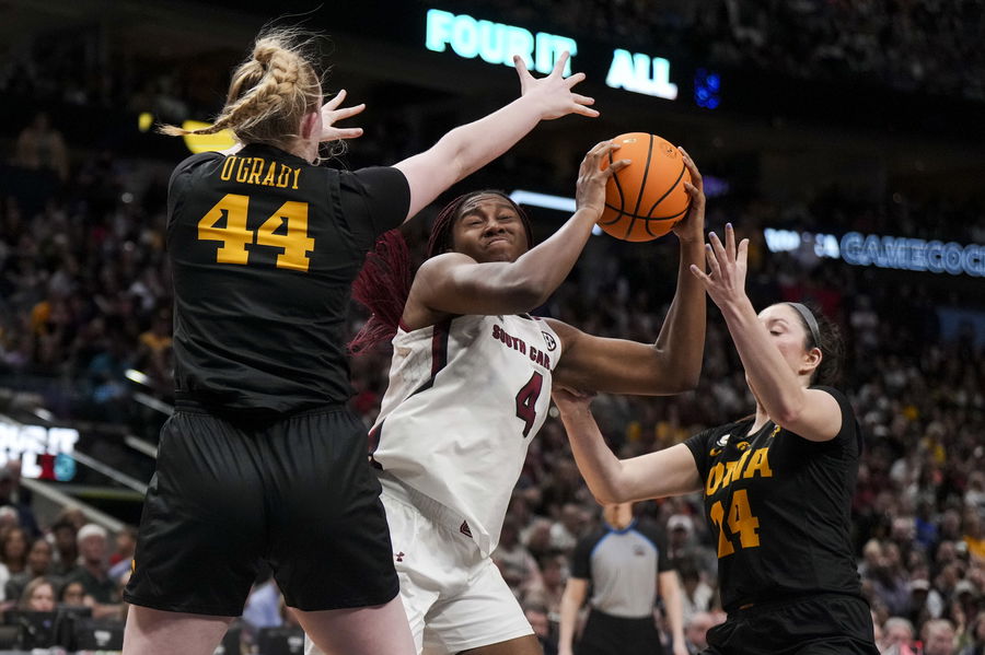 Mar 31, 2023; Dallas, TX, USA; South Carolina Gamecocks forward Aliyah Boston (4) controls the ball against Iowa Hawkeyes forward Addison O’Grady (44) and guard Gabbie Marshall (24) in the second half in semifinals of the women’s Final Four of the 2023 NCAA Tournament at American Airlines Center. Mandatory Credit: Kirby Lee-USA TODAY Sports