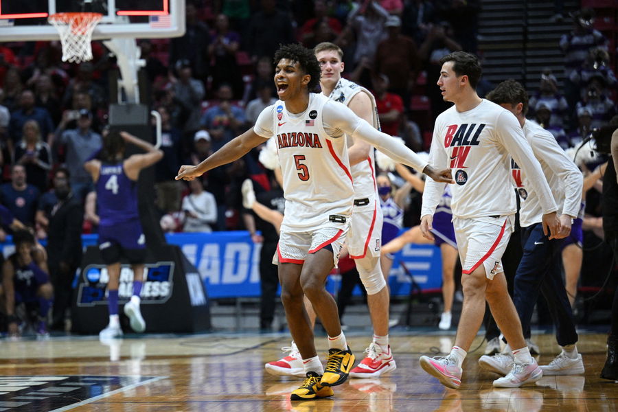 Mar 20, 2022; San Diego, CA, USA; Arizona Wildcats guard Justin Kier (5) celebrates after the Arizona Wildcats defeated the TCU Horned Frogs in overtime during the second round of the 2022 NCAA Tournament at Viejas Arena. Mandatory Credit: Orlando Ramirez-USA TODAY Sports