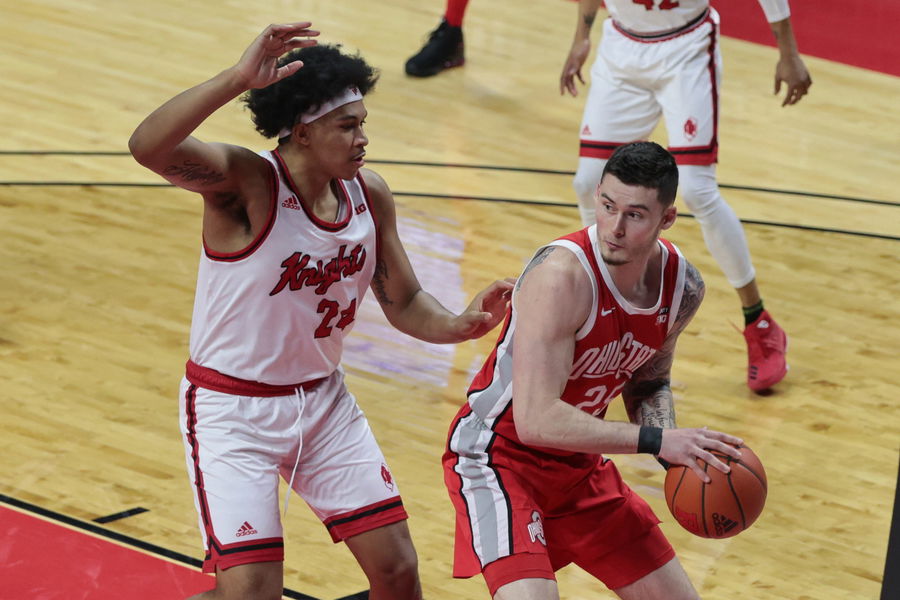 Jan 9, 2021; Piscataway, New Jersey, USA; Ohio State Buckeyes forward Kyle Young (25) looks to pass as Rutgers Scarlet Knights guard Ron Harper Jr. (24) defends during the first half at Rutgers Athletic Center (RAC). Mandatory Credit: Vincent Carchietta-USA TODAY Sports
