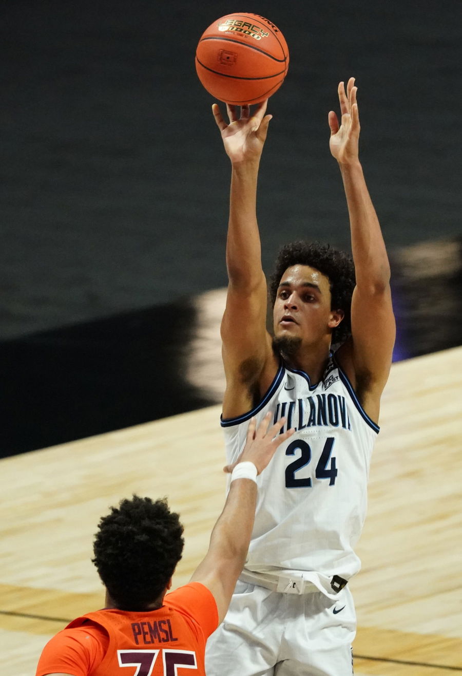Nov 28, 2020; Uncasville, Connecticut, USA; Villanova Wildcats forward Jeremiah Robinson-Earl (24) shoots against Virginia Tech Hokies in the first half at Mohegan Sun Arena. Mandatory Credit: David Butler II-USA TODAY Sports