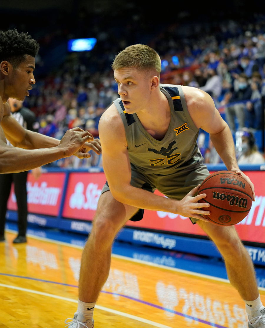 Dec 22, 2020; Lawrence, Kansas, USA; West Virginia Mountaineers guard Sean McNeil (22) controls the ball against the Kansas Jayhawks during the second half at Allen Fieldhouse. Mandatory Credit: Denny Medley-USA TODAY Sports