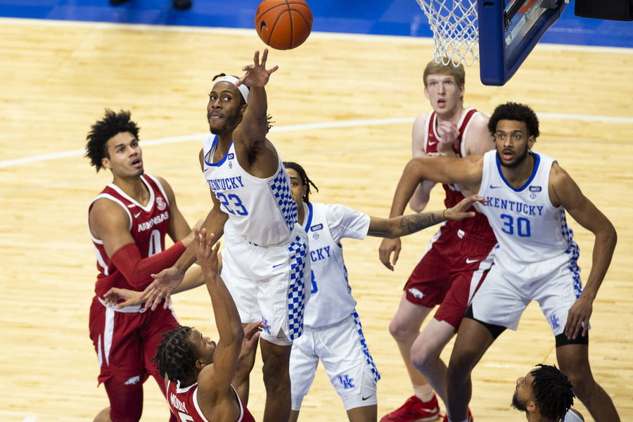 Feb 9, 2021; Lexington, Kentucky, USA; Kentucky Wildcats forward Isaiah Jackson (23) blocks a basket by Arkansas Razorbacks guard Moses Moody (5) during the first half of the game at Rupp Arena at Central Bank Center. Mandatory Credit: Arden Barnes-USA TODAY Sports