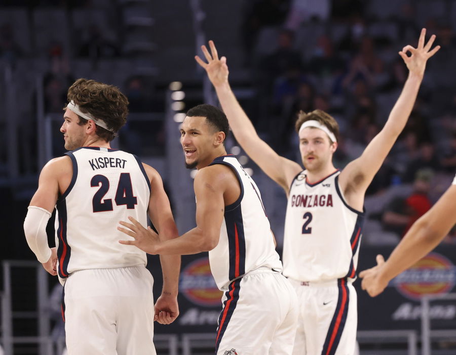 Dec 26, 2020; Fort Worth, Texas, USA; Gonzaga Bulldogs forward Corey Kispert (24) celebrates with guard Jalen Suggs (1) and forward Drew Timme (2) during the second half against the Virginia Cavaliers at Dickies Arena. Mandatory Credit: Kevin Jairaj-USA TODAY Sports
