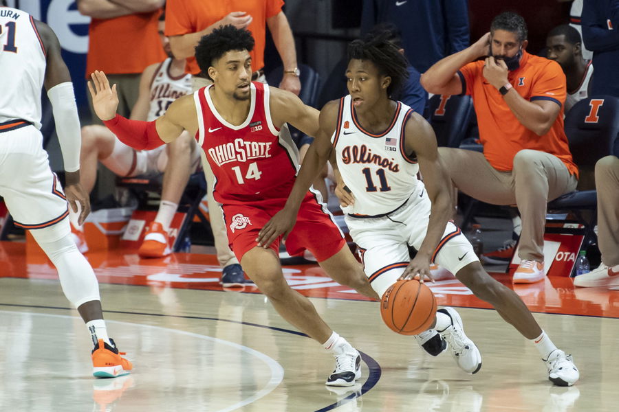 Jan 16, 2021; Champaign, Illinois, USA; Illinois Fighting Illini guard Ayo Dosunmu (11) drives against Ohio State Buckeyes forward Justice Sueing (14) during the second half at the State Farm Center. Mandatory Credit: Patrick Gorski-USA TODAY Sports