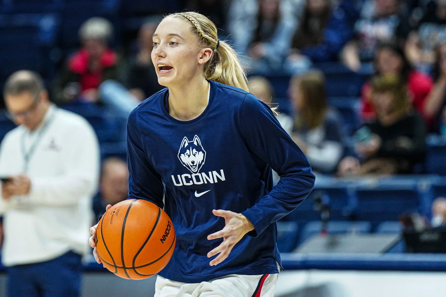 Nov 10, 2024; Storrs, Connecticut, USA; UConn Huskies guard Paige Bueckers (5) warms up before the start of the game against the South Florida Bulls at Harry A. Gampel Pavilion. Mandatory Credit: David Butler II-Imagn Images