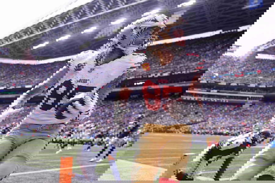NFL, American Football Herren, USA San Francisco 49ers at Seattle Seahawks Sep 7, 2025 Seattle, Washington, USA San Francisco 49ers tight end George Kittle 85 celebrates after scoring a touchdown during the first half against the Seattle Seahawks during the first quarter at Lumen Field. Seattle Lumen Field Washington USA, EDITORIAL USE ONLY PUBLICATIONxINxGERxSUIxAUTxONLY Copyright: xJoexNicholsonx 20250907_tdc_sn8_618