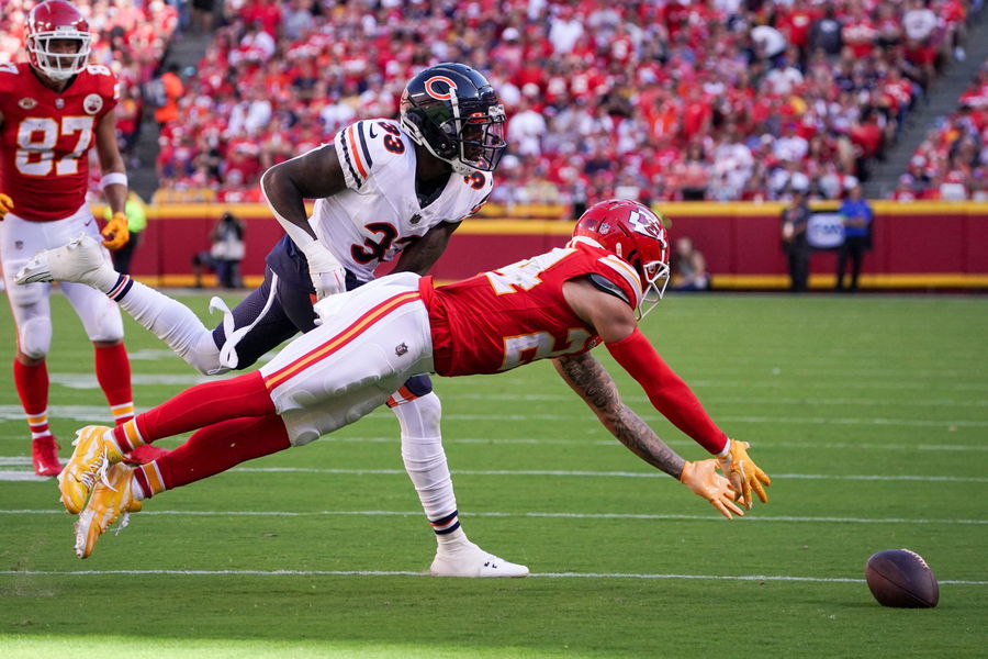 Sep 24, 2023; Kansas City, Missouri, USA; Kansas City Chiefs wide receiver Skyy Moore (24) can’t make a catch as Chicago Bears cornerback Jaylon Johnson (33) defends during the first half at GEHA Field at Arrowhead Stadium. Mandatory Credit: Denny Medley-USA TODAY Sports