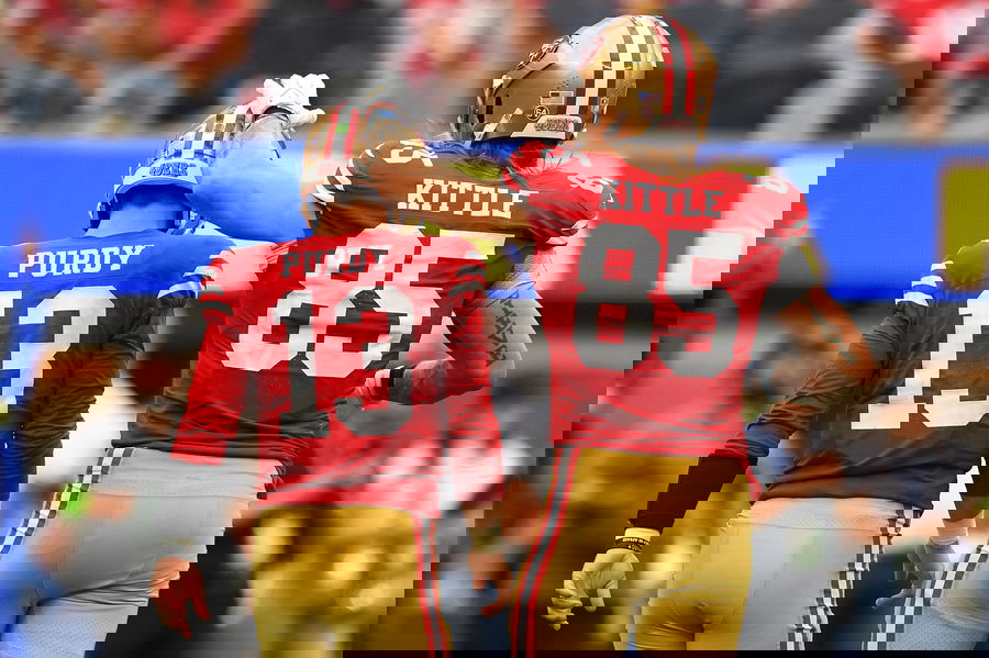 INGLEWOOD, CA – SEPTEMBER 17: San Francisco 49ers tight end George Kittle 85 consoles San Francisco 49ers quarterback Brock Purdy 13 during the NFL, American Football Herren, USA game between the San Francisco 49ers and the Los Angeles Rams on September 17, 2023, at SoFi Stadium in Inglewood, CA. Photo by Brian Rothmuller/Icon Sportswire NFL: SEP 17 49ers at Rams EDITORIAL USE ONLY Icon2309170045