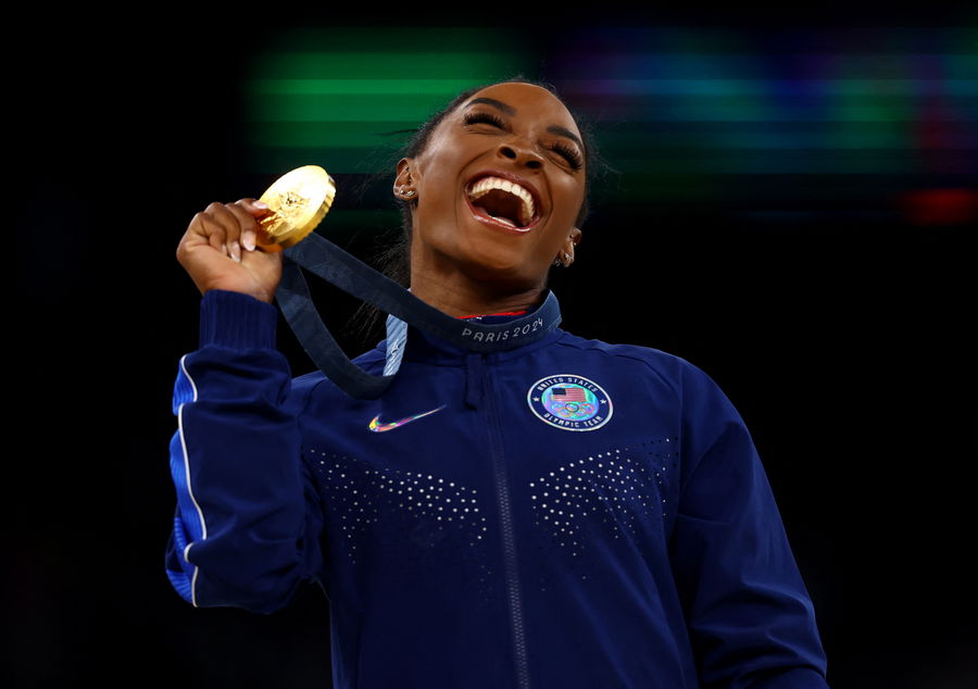 Paris 2024 Olympics – Artistic Gymnastics – Women’s Vault Victory Ceremony – Bercy Arena, Paris, France – August 03, 2024. Gold medallist Simone Biles of United States celebrates on the podium with her medal. REUTERS/Hannah Mckay