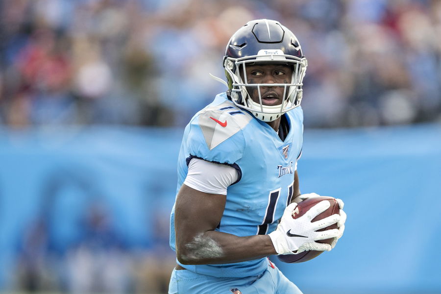 INDIANAPOLIS, INDIANA – NOVEMBER 29: A.J. Brown #11 of the Tennessee Titans reacts following a touchdown reception in the first quarter during their game against the Indianapolis Colts at Lucas Oil Stadium on November 29, 2020 in Indianapolis, Indiana. (Photo by Andy Lyons/Getty Images)