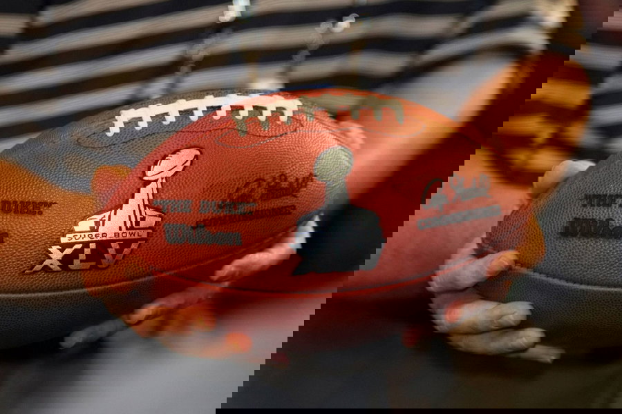 Ball mit dem Logo des Super Bowl XLV – Vorstellung Logo Super Bowl XLV, Super Bowl XLV Pressekonferenz; American Football Herren USA NFL Super Bowl Superbowl Miami Präsentation Pressetermin Objekte Ball vdig xng 2010 quer premiumd o0 Ausrüster, Sportausrüster, Hersteller, Sportartikelhersteller, Sportartikel Wilson o0 Spielgerät, Sportgerät Emblem