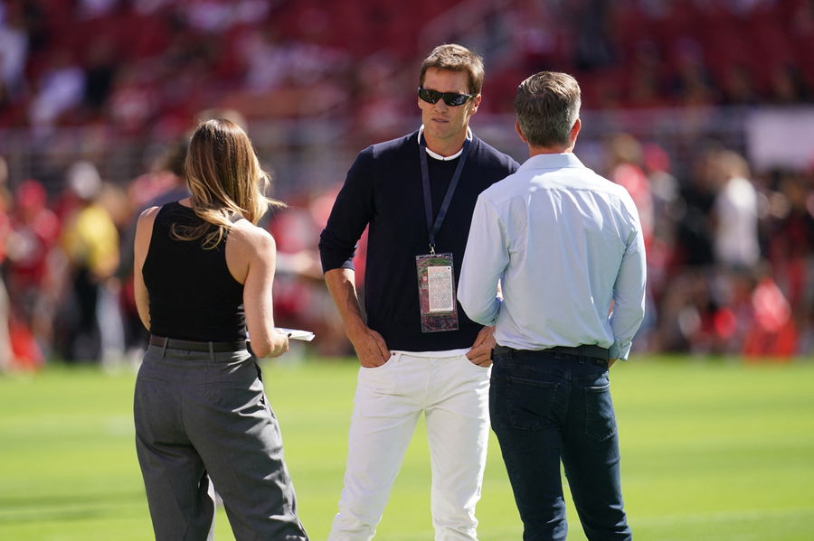 Aug 18, 2024; Santa Clara, California, USA; Former NFL quarterback Tom Brady stands on the field before the start of the game between the New Orleans Saints and the San Francisco 49ers at Levi’s Stadium. Mandatory Credit: Cary Edmondson-USA TODAY Sports