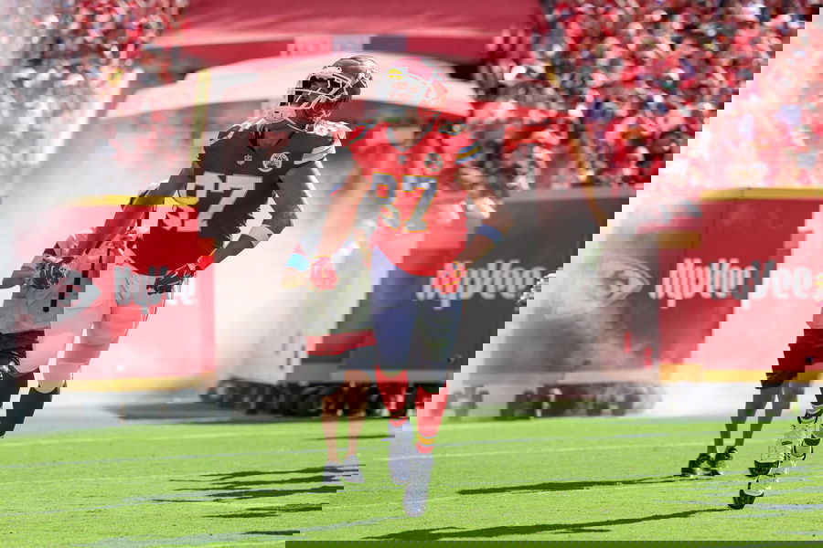NFL, American Football Herren, USA 2024: Bengals vs Chiefs SEP 15 September 15, 2024: Kansas City Chiefs tight end Travis Kelce 87 runs on to the field before a game against the Cincinnati Bengals at GEHA Field at Arrowhead Stadium in Kansas City, MO. David Smith/CSM Credit Image: David Smith/Cal Media Kansas City Mo United States of America EDITORIAL USE ONLY Copyright: xx ZUMA-20240915_zma_c04_220.jpg DavidxSmithx csmphotothree295202