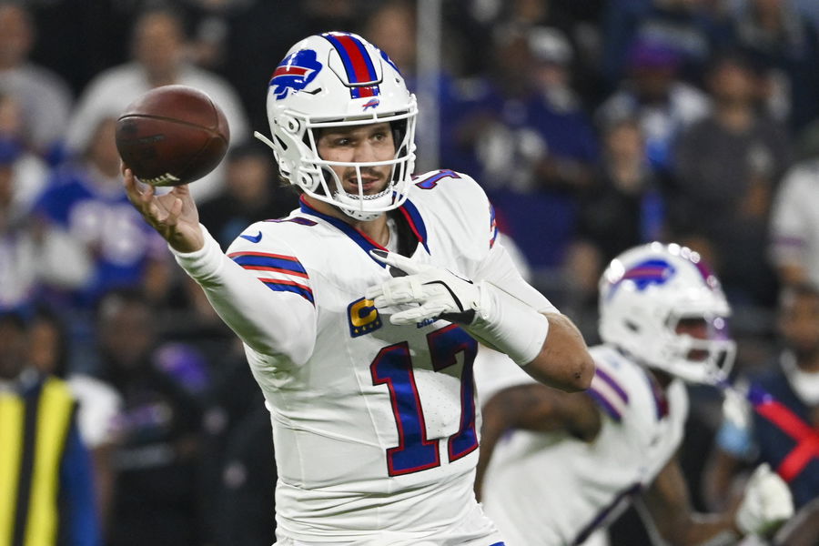 Sep 29, 2024; Baltimore, Maryland, USA; Buffalo Bills quarterback Josh Allen (17) throws form the pocket during the first quarter against the Baltimore Ravens at M&T Bank Stadium. Mandatory Credit: Tommy Gilligan-Imagn Images